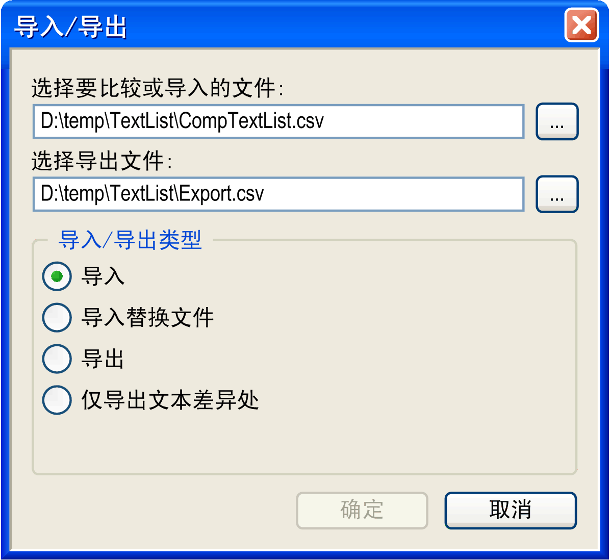 通过输入相应路径或利用输入助手 (),可以指定要导入、导出或比较的文件。通过激活该对话框下部的相应条目,可以定义应执行的操作: