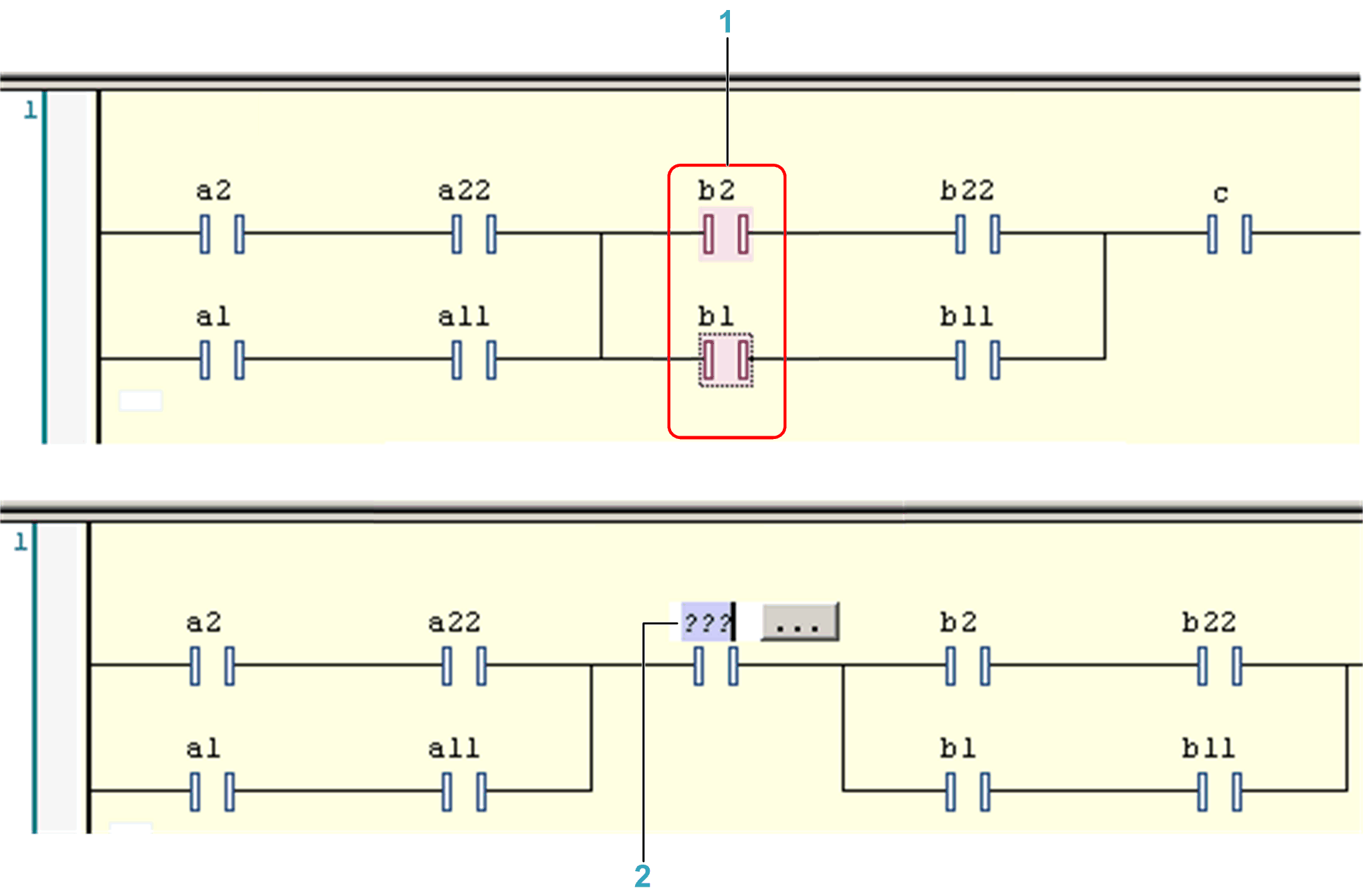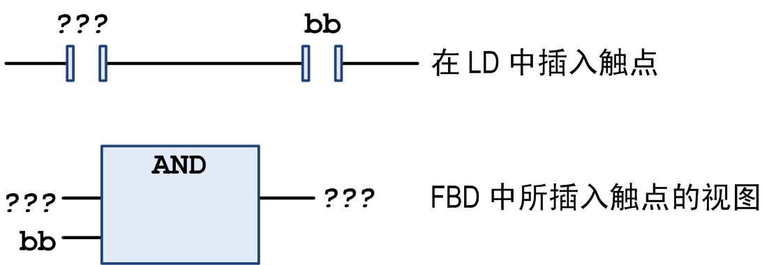 新触点将插到当前选定触点或运算块左侧的行中。如果光标位置是在当前并行连接内,则新触点元素也在其内部插入。