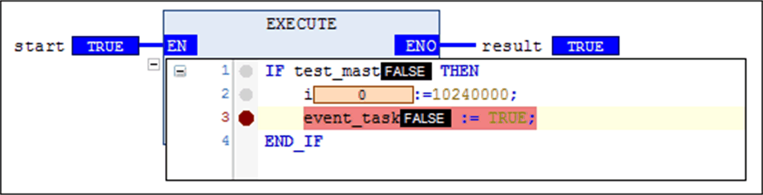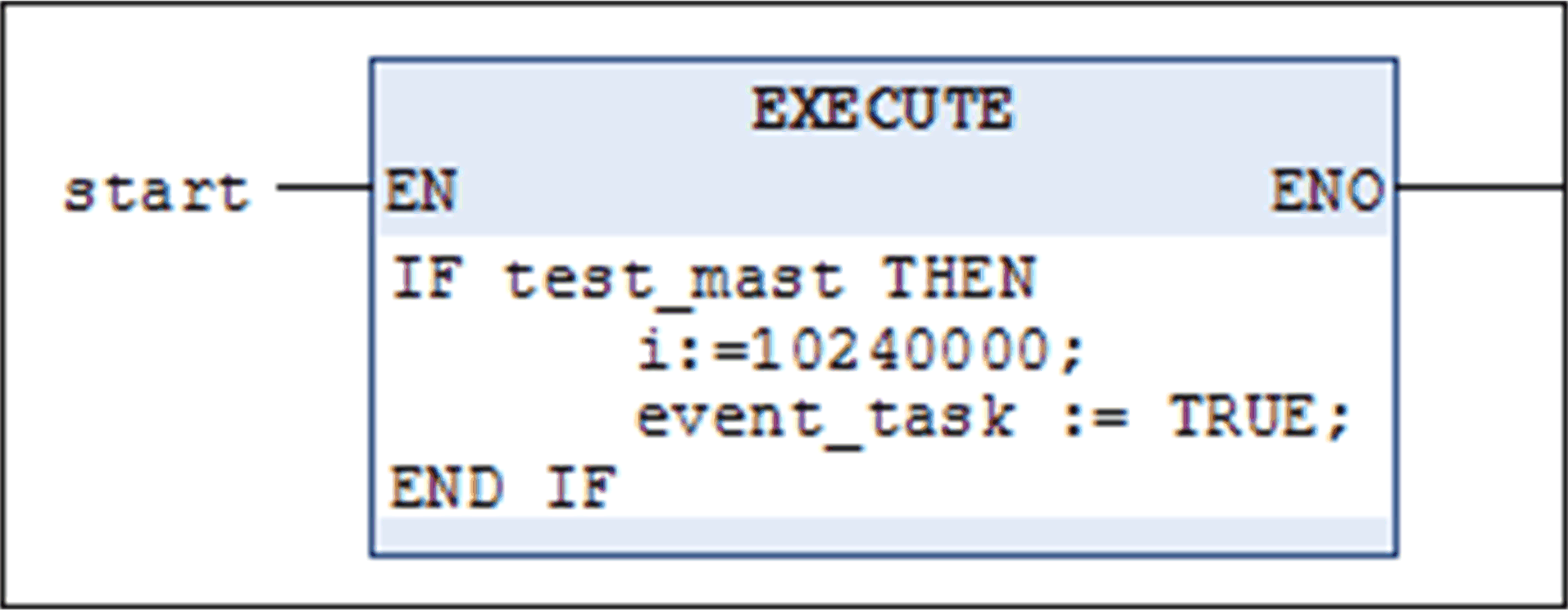 Execute 元素是包含 EN/ENO 的功能块,您可以将其插入 FBD 或 LD 网络并且对其填入 ST 代码。在功能块被激活以用于使用 EN 输入处的 TRUE 信号进行处理时,会执行 ST 代码。