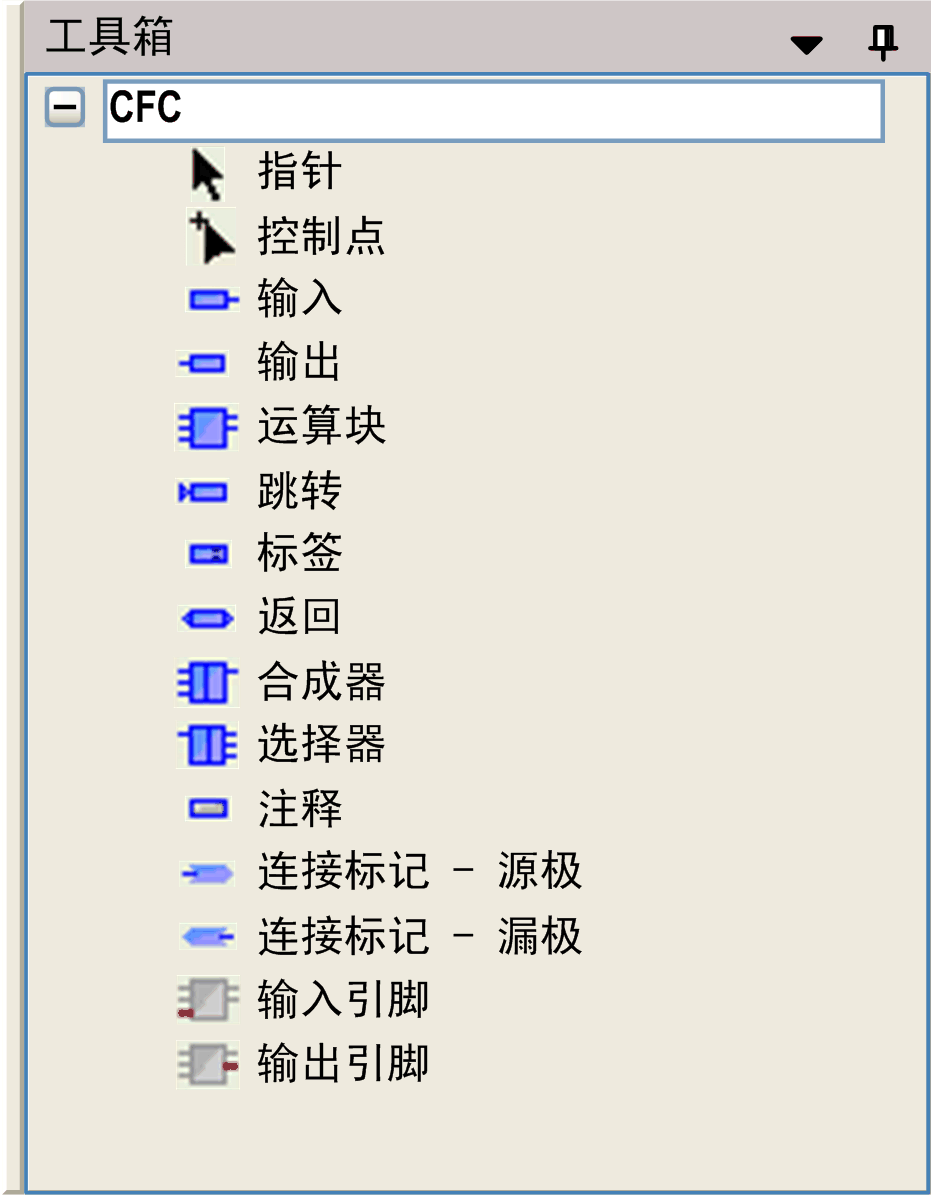 可用于 CFC 编辑器窗口中编程的图形元素由工具箱提供。通过在菜单中执行命令来打开工具箱。