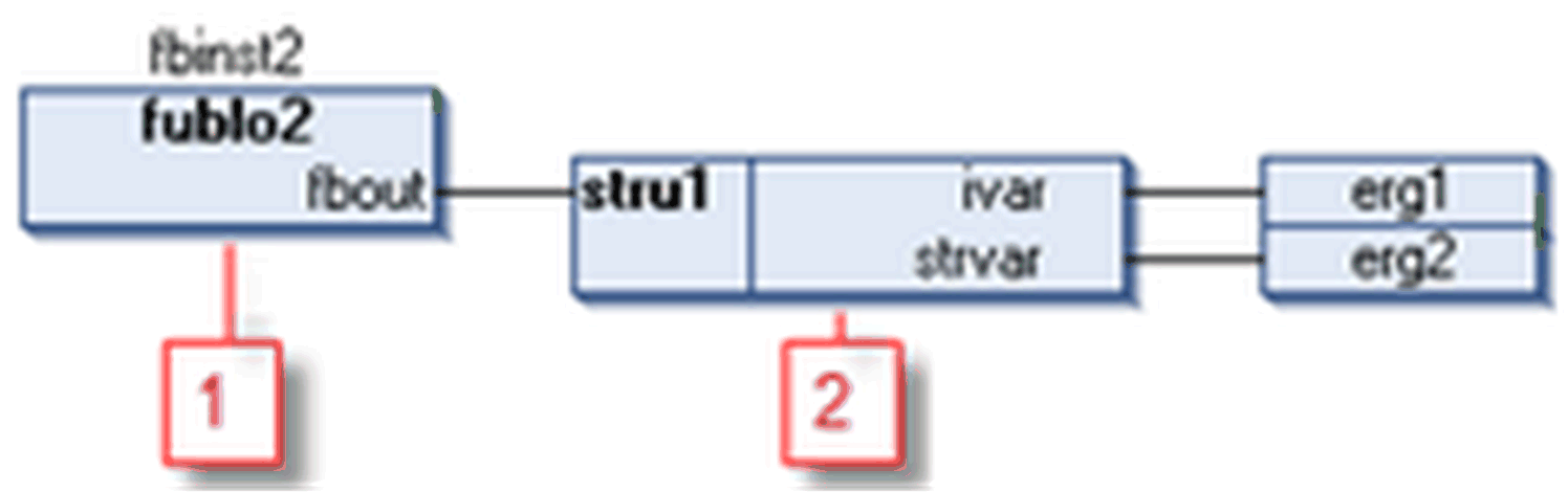CFC 程序 cfc_prog 处理功能块 fublo1 的实例,该功能块具有结构类型的输入变量 struvar。使用合成器元素来访问结构组件。