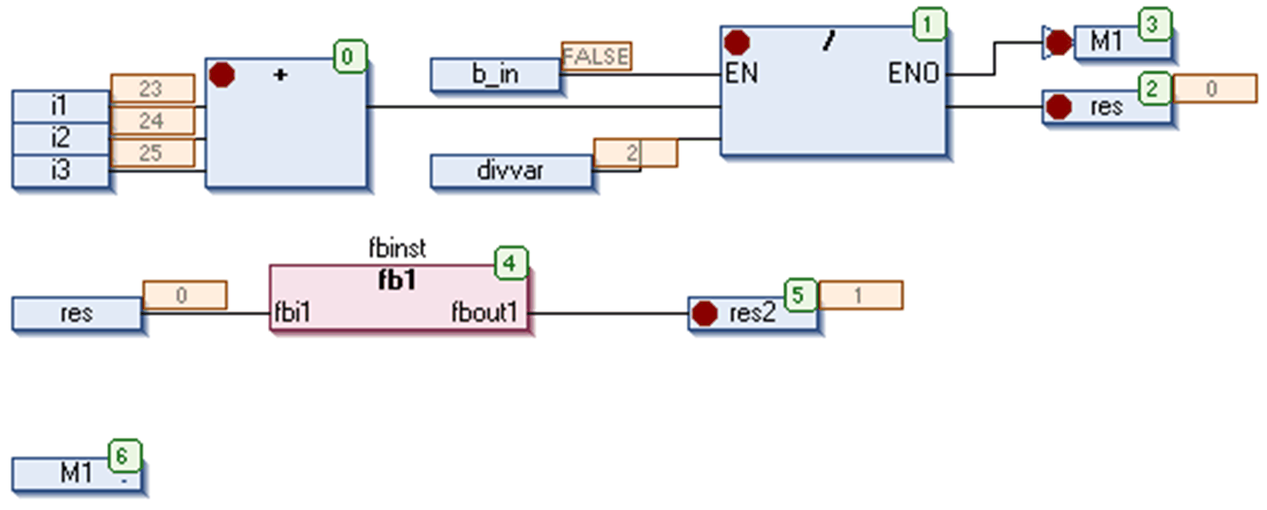 请注意,对于功能块 POU 的在线视图,只能在实例视图中执行监控。在功能块 POU 的基本实现中,不显示任何值。一列包含文本,并且实现部分中的在线监控字段显示分别显示三个问号。