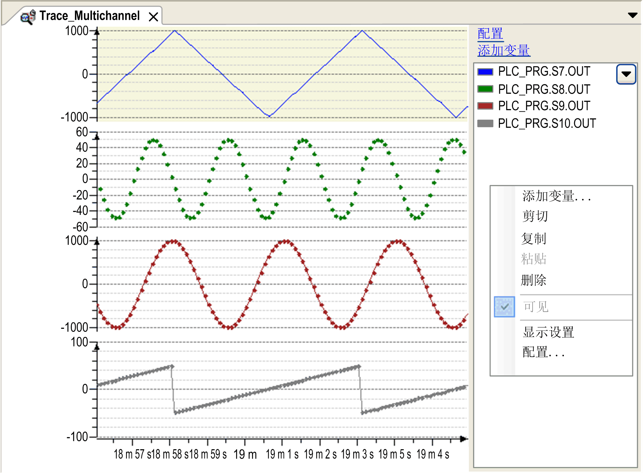 为了于在线模式下启动跟踪,可通过执行命令将跟踪配置下载到控制器。跟踪变量的图形显示在您可在其中把它们存储到外部文件的跟踪编辑器窗口中。可将该文件重新加载到编辑器。另请参阅在线模式下的跟踪编辑器。