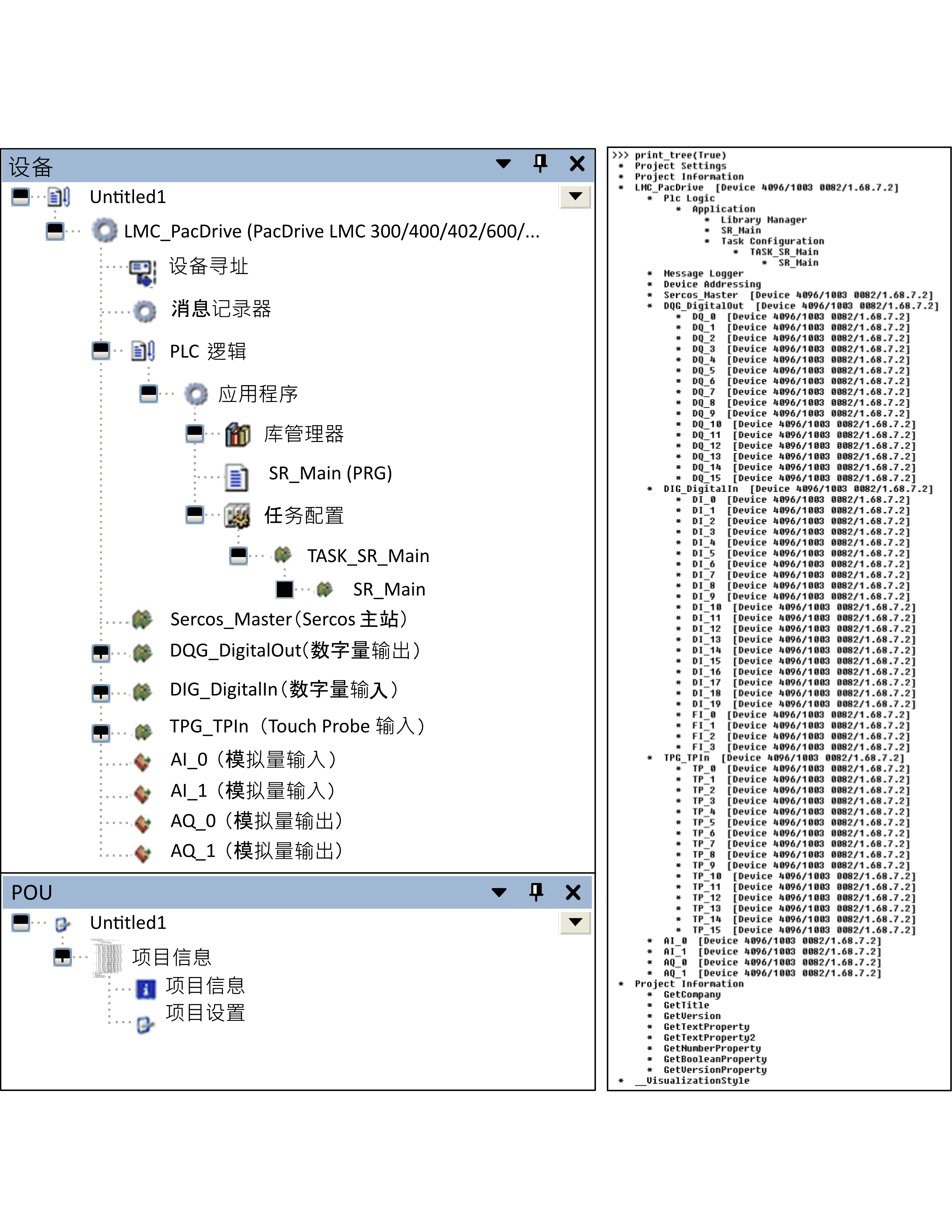 图中显示了用户界面中的项目树对象以及通过脚本打印的遍历项目树: