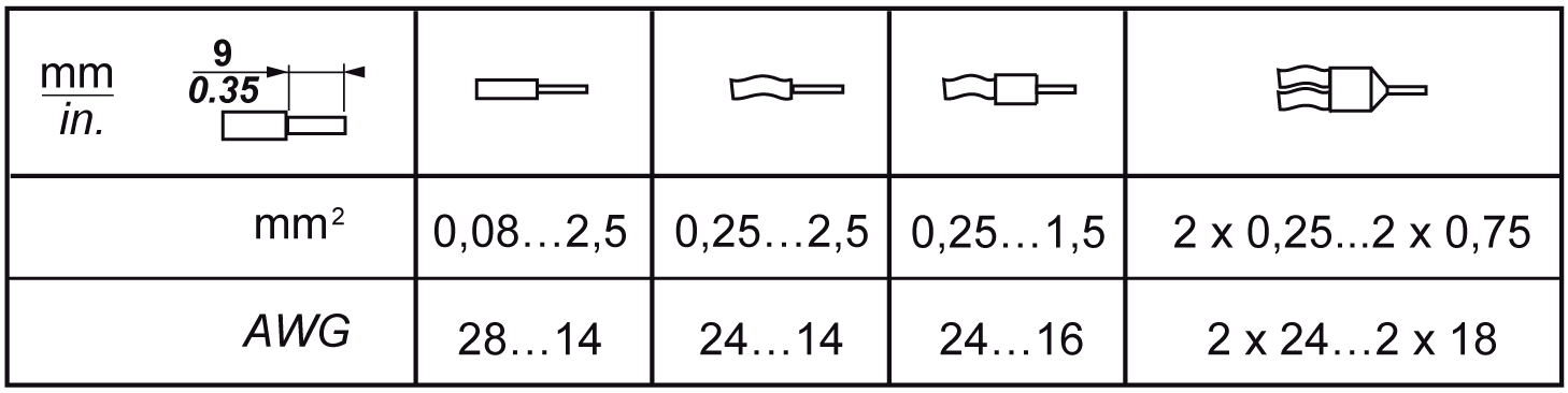 The spring clamp connectors of the terminal block are designed for only one wire or one cable end. Two wires to the same connector must be installed with a double wire cable end to help prevent loosening.