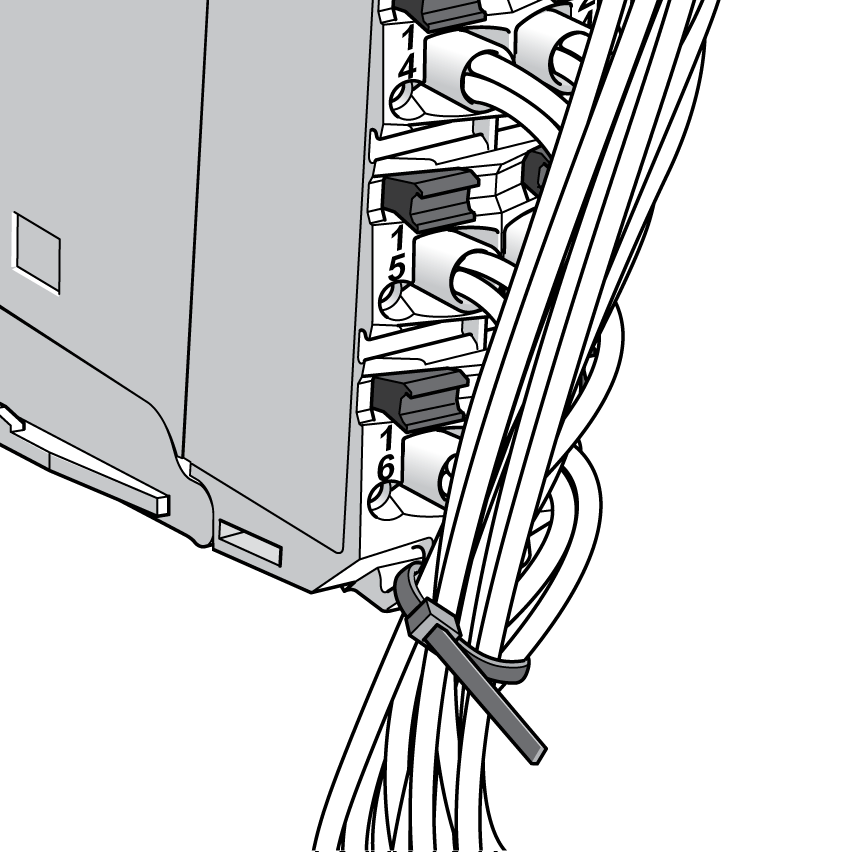 The terminal blocks have slots to attach cable ties. A cable tie can be fed through this slot to secure cables and wires to reduce stress between them and the terminal block connections.