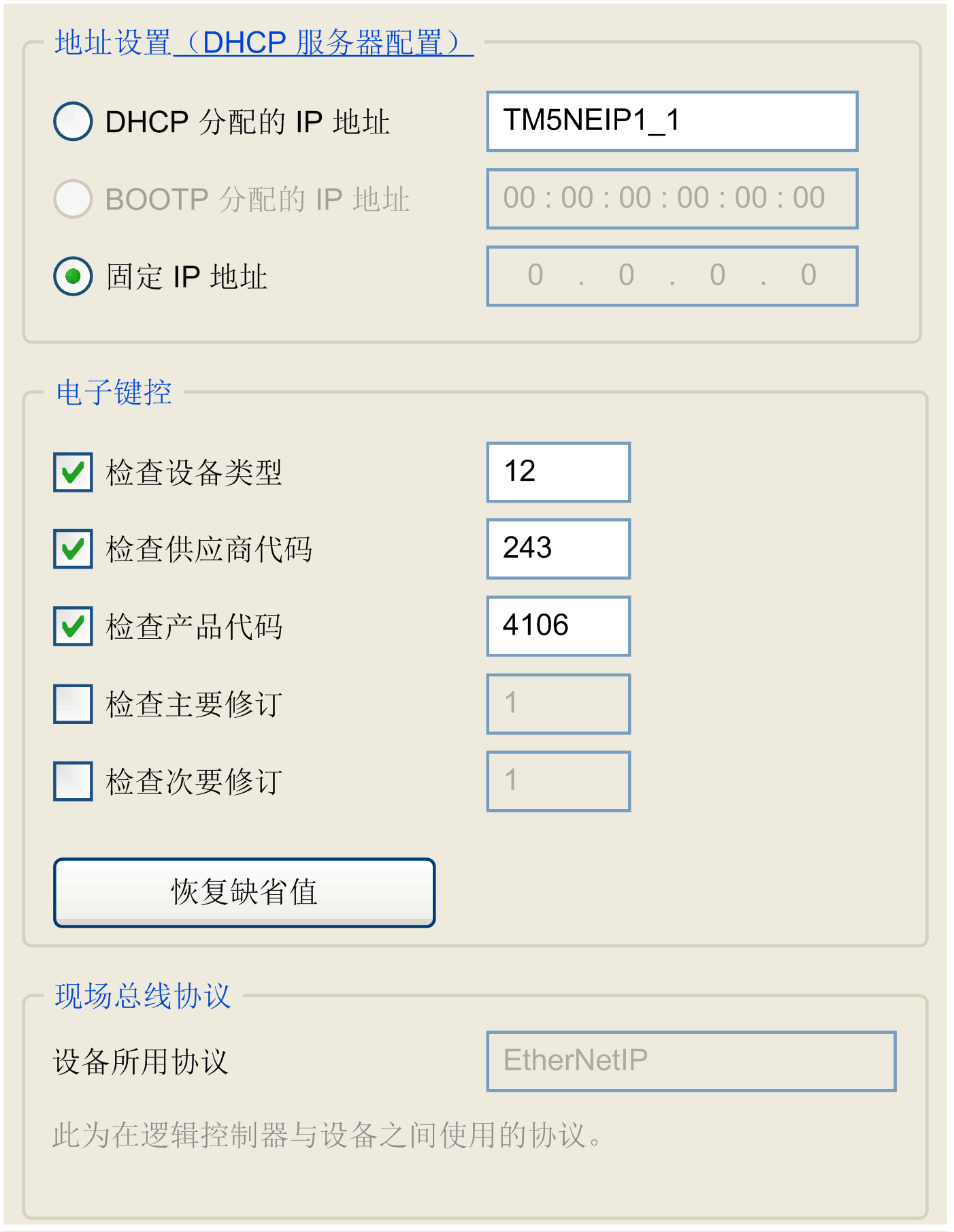 签名用于识别设备。是包含在设备固件中的信息(供应商代码、产品代码、...)。当控制器扫描器启动时,它会将每个选中的电子键控值与设备中对应的信息进行对比。如果设备值与应用程序值不相同,则逻辑控制器将不再与该设备进行通讯。