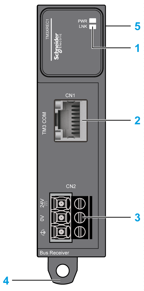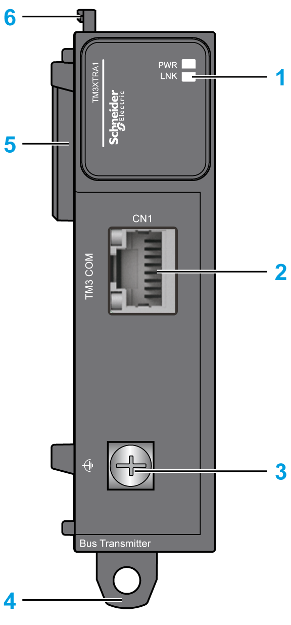 下表描述上面显示的 TM3XTRA1 发射器扩展模块的主要元件:
