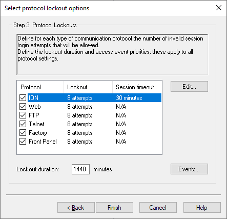 - Click Next to navigate to the Select protocol lockout options screen: