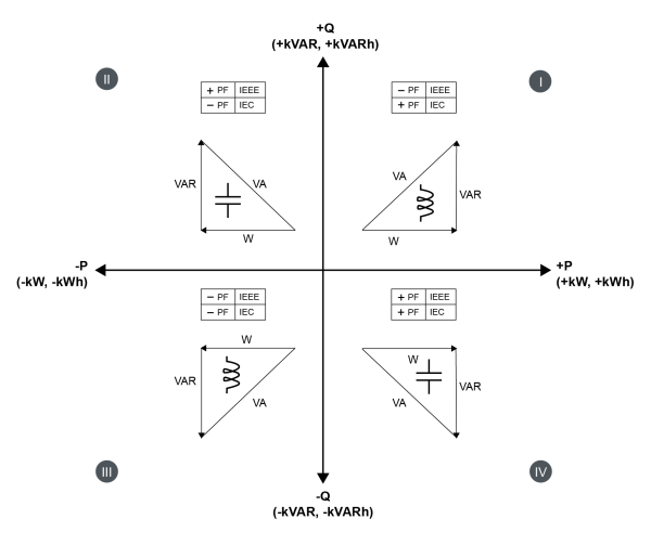 Positive real power P(+) flows from source to load, and negative real power P(-) flows from the load to the power source.