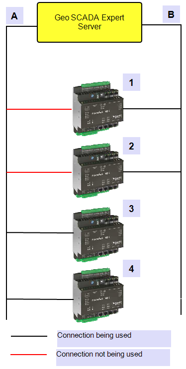 The last two outstations in the set use only one channel (Line A). These outstations, which have addresses 3 and 4, are in the same shared set, but have their communications fixed on Line A. The outstations communicate with the Geo SCADA Expert server using only one direct channel.