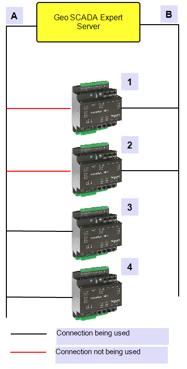 Outstations 1 and 2 are using Line B to communicate with the Geo SCADA Expert server, whereas outstations 3 and 4 are using Line A.