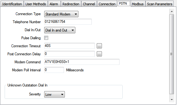 Use fields on the PSTN tab of each Outstation Form to define which PSTN channels an outstation can use to dial in to the Geo SCADA Expert server (see Define Dial In Line Properties on a PSTN Outstation). Also see this reference for an example that demonstrates how the various Dial In/Out settings might be used on a Geo SCADA Expert system.