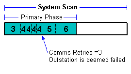 In the next System Scan after the Reestablishment Interval has elapsed, the driver does manage to make contact with Outstation 4. However as the outstation was previously marked as failed, the driver performs a full Establishment Phase scan on the outstation. The driver performs this type of scan to help to ensure that the data retrieved from the outstation is fully up to date.