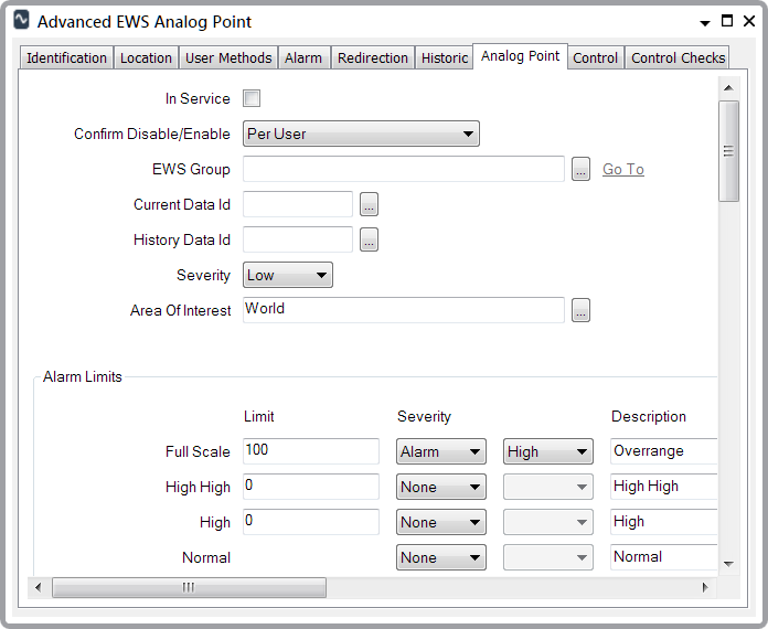 Configure the properties of each analog point using the fields on the Advanced EWS Analog Point Form.