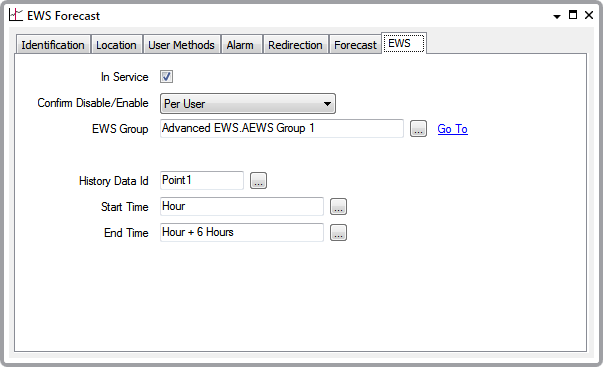 Use the EWS tab to define the EWS-specific properties for the Advanced EWS Forecast Item.