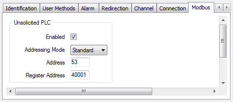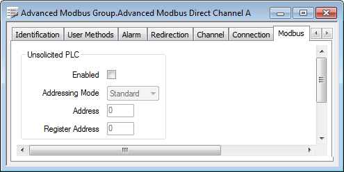 Use the fields within the Unsolicited PLC section of the Modbus tab to define whether unsolicited PLC functionality is enabled for the controllers on a channel.