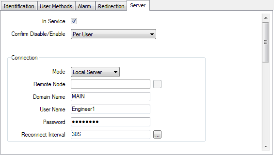 The Form has several tabs. This topic explains about the properties that are on the Server tab. Properties on other tabs are common to many database items, see Tabs That are Common to Many Configuration Forms in the Geo SCADA ExpertGuide to Advanced Drivers.