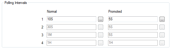 Use the required Promoted field(s) to specify the frequency with which Geo SCADA Expert is to poll the radio for data whenever the relevant points are displayed on a client. Each Promoted frequency replaces the corresponding Normal frequency while scanning is promoted on the radio. Enter the required interval in the OPC Time Format. You can enter the value directly in the field, or use the Interval window (accessed via the field's browse button) to specify the required value.