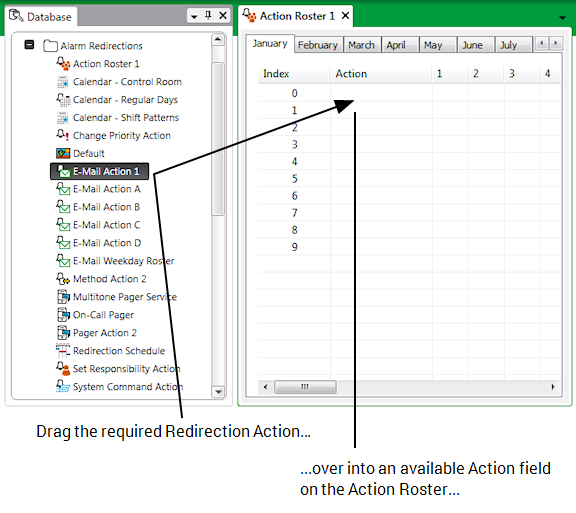- In the Database Bar, select the redirection action that you want to add to the roster—do not release the mouse button.