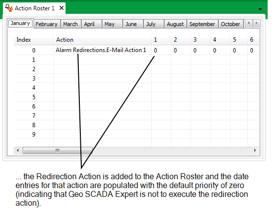 The redirection action is displayed on the roster. The date entries on the Roster calendar for that action are populated with the default priority of zero.