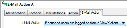 On the E-Mail Action tab of the E-Mail Action's configuration Form, the Inhibit Action property is set to 'If actioned users are logged on from a ViewX client'.