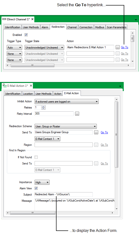 Each alarm redirection triggers an action (see Choose a Type of Alarm Redirection), an action roster (see Action Roster), or an alarm redirection calendar (see Alarm Redirection Calendar). The entry that is specified in the Action field on the Redirection tab, determines what happens when an alarm meets the redirection criteria and is redirected.
