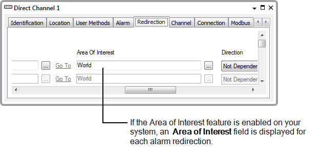 If the Area of Interest feature is enabled on your system, an Area of Interest field is available for each alarm redirection on the Redirection tab.