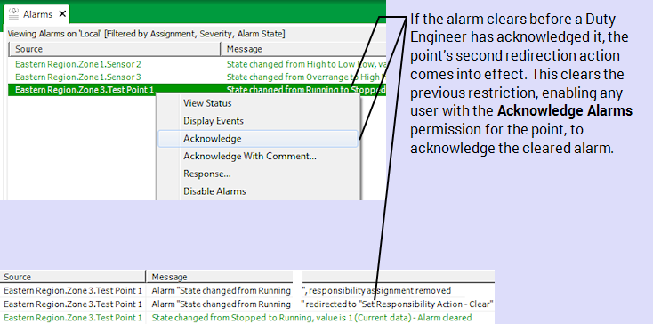 - The above restriction is removed if the alarm condition clears, so that any user with the appropriate permissions and access to the alarm can acknowledge the cleared alarm.