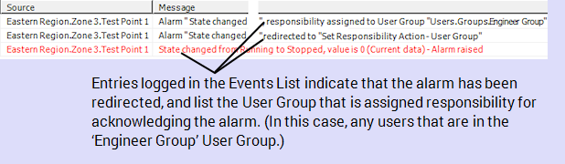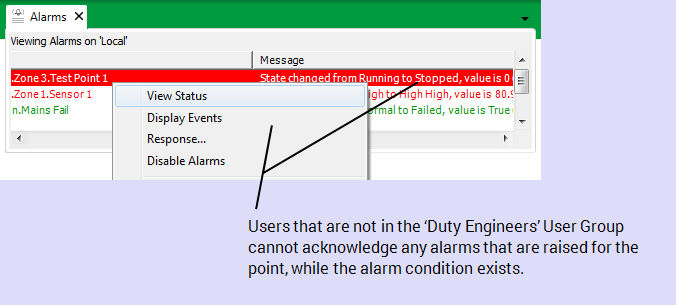 - The ability to acknowledge an alarm is restricted while the alarm condition exists, to those users that are in the User Group ‘Duty Engineers’