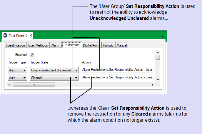 The required alarm restrictions are specified on the Redirection tab on the point’s configuration Form: