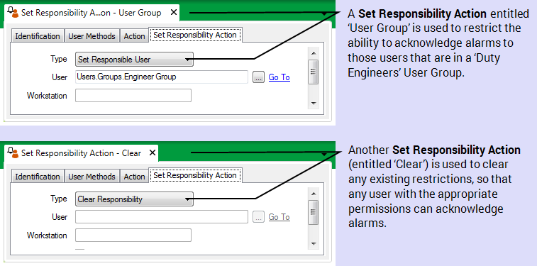 This example demonstrates how Set Responsibility Actions might be used to restrict the ability to acknowledge alarms, and clear that restriction under specific circumstances.