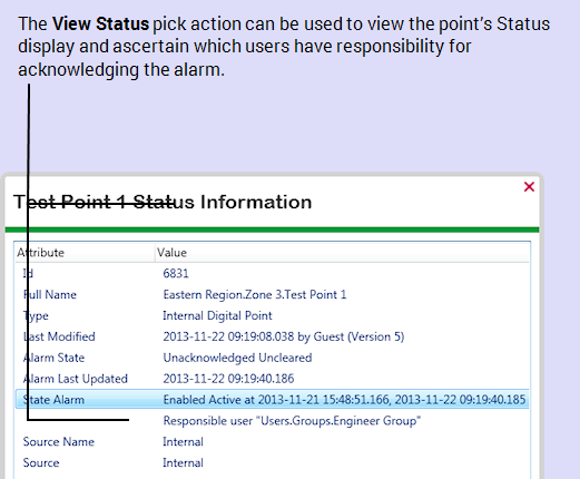 Should the alarm condition clear before a Duty Engineer acknowledges the alarm, the restriction is removed and any user that is allocated the Acknowledge Alarms security permission for the point can acknowledge the cleared alarm: