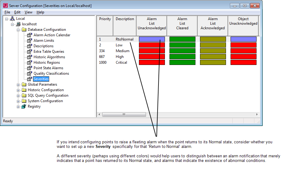 If you do use this feature, consider whether to configure 'Return to Normal' alarms in such a way as to clearly distinguish them from other types of alarm. For example, by creating and using a Severity level specifically for such alarms, and configuring that Severity level to use different colors to other alarms on your system. This will enable users to clearly distinguish between alarm notifications that indicate an abnormal occurrence, and those of a 'Return to Normal' alarm. You define Severity levels using the Geo SCADA Expert Server Configuration Tool (see Alarm and Event Severities).