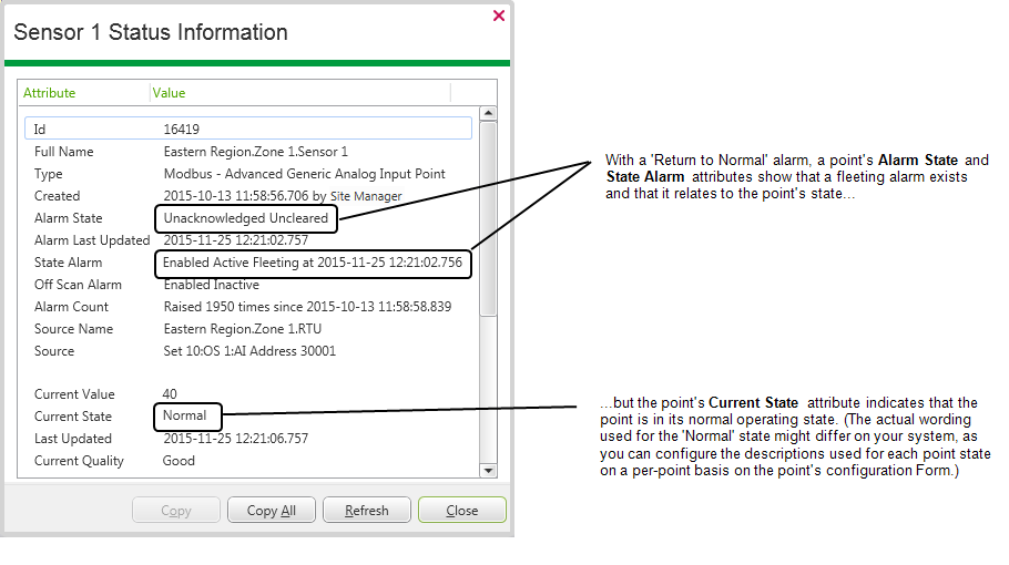 As with other alarms, 'Return to Normal' alarms are affected by other configuration, including (if applicable to the points', or your system's configuration):