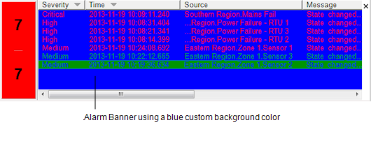You can use the Option window’s Alarms and Events tab to define a custom background color for the Alarms List and Alarm Banner. The color that you choose will be shown behind the text for each alarm entry, but only for alarms that are not affected by the Background Colors for the severity range. You can choose background colors for each severity in the Server Configuration Tool’s Severity settings (see Define the Background Colors for a Severity in the Geo SCADA Expert Guide to Server Administration).