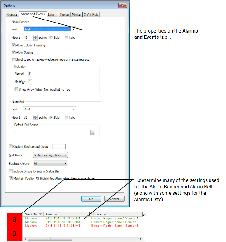 Geo SCADA Expert has predefined default settings that affect the appearance and behavior of the Alarm Banner and Alarms Lists on ViewX clients. For example, there are default settings for the type of fonts used, the sort order, and the default alarm bell sound. By using the Options window, you can adjust these settings to suit your own requirements.