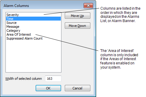 Severity, Time, Source, Message, and Category columns are included by default (along with the ‘Area of Interest’ column, if the Area of Interest feature is enabled on your system). It is also possible to add additional columns to the Alarms Lists and Alarm Banner—if such columns have been added to the alarm displays on your system, these will also be listed in the Alarm Columns window.