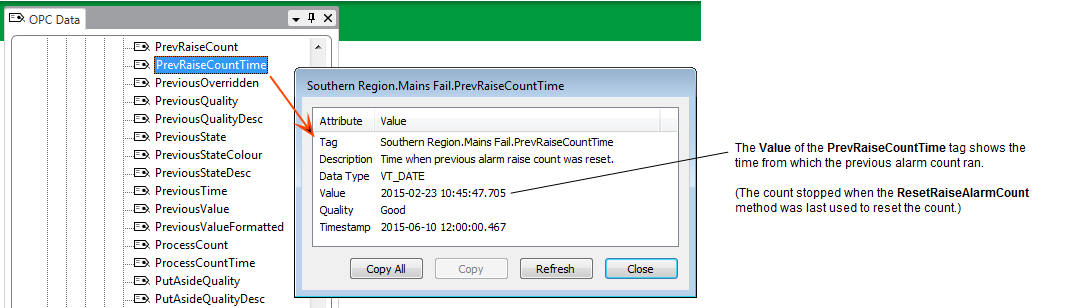 • PrevRaiseCountTime—The date and time that from which the previous Alarm Count ran (up until the count ended when the ResetAlarmRaiseCount method was last executed).
