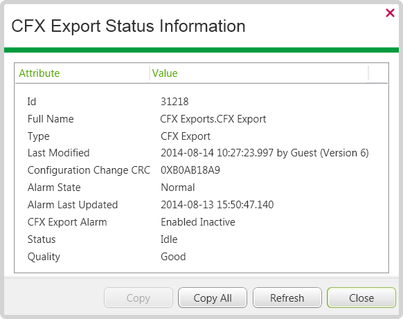 Every item in the Geo SCADA Expert database has its own Status display (also referred to as a View window or View dialog). You view an item's Status display by selecting that item's View Status pick action or menu option. The Status display provides information about the status of the selected item, presenting the information in the form of 'status attributes'. For further information about working with Status displays, see Status Displays.