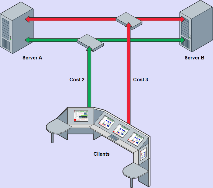 For the client with a LAN connection to server A, the LAN connection has a cost of 2. The connection to server B has a cost of 3—the cost is higher as it is not the preferred connection. When the client is started, it will attempt to connect to server A via the LAN in preference to connecting to server B via the WAN.
