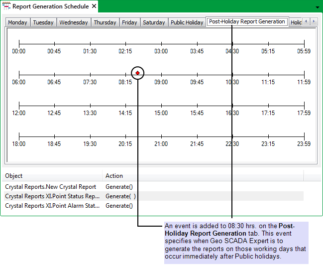 However, on those Mondays (such as 2nd January and 17th April) that are defined as Public Holidays, no reports are generated. Instead, on the dates that immediately follow those days (dates that are specified as ‘Post-Holiday Report Generation’ days), Geo SCADA Expert generates the three area reports at 08:30hrs.