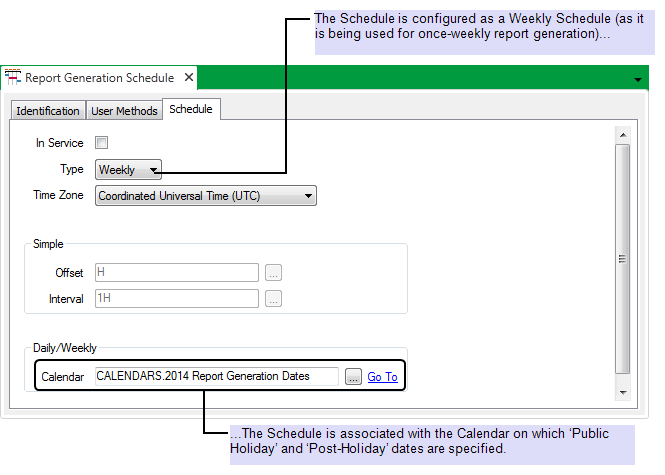 A Weekly Schedule is used to generate the reports automatically. The Schedule is associated with a Calendar, to enable report generation to be suitably delayed on the weeks on which the Monday occurs on a Public holiday.