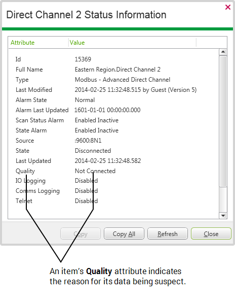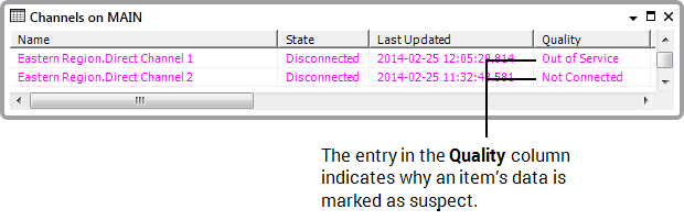 The quality attribute of an item that has invalid configuration will indicate either Not Connected or Configuration Error, depending on the specific configuration error(s).