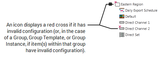 Invalid configuration is also indicated in the Database Bar by a red cross appearing over the icon that represents the item: