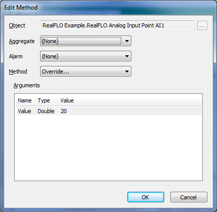 The ‘Override’ Method for an analog point has one argument, which you use to specify the value to which Geo SCADA Expert is to override the point.