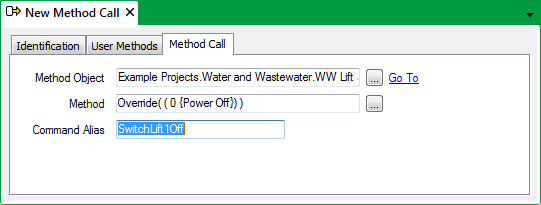 - Method Call—Use to specify the item on which Geo SCADA Expert is to perform an action and the action that Geo SCADA Expert is to use: