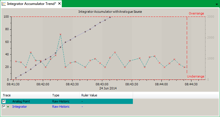 In the Trend above, the Analog point trace is attached to the left y-axis and the Integrator Accumulator trace is attached to the right y-axis. The integration value is effectively the area under the Analog point’s trace (as the integral of a value is value x time).