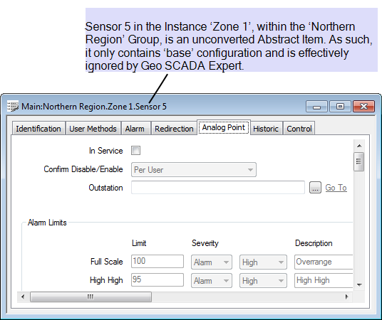 An unconverted Abstract Item only contains basic configuration and is ignored by Geo SCADA Expert.