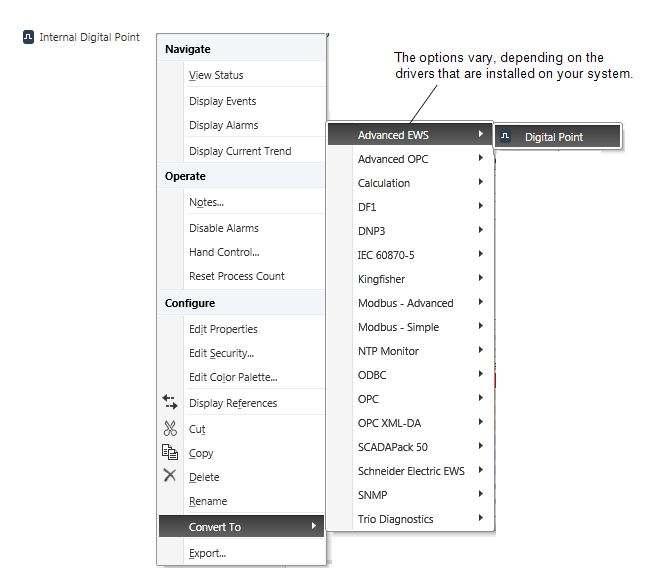 The Convert To feature allows you to convert a database item into another item of a similar type—for example, to convert an internal digital point into a Modbus digital point. This feature is only available to specific types of database item, and is designed to provide: